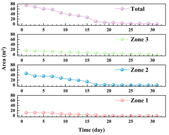 Figure 11 illustrates. The average temperature shows an increasing trend, similar to the average temperature changes observed in the YOZ plane. This is attributed to the high temperatures in August intensifying the heat and moisture transfer processes within the grain pile. Figure 12 presents the trend of low-temperature zone area changes in the XOZ plane during one month of storage, while Figure 13 shows the temperature distribution contour maps of the XOZ plane during the same period. By the 7th day of storage, the XOZ plane of the grain pile still exhibits three characteristic low-temperature zones. Compared to the initial values, the simulated total area of the low-temperature zones is reduced by 22.97%. Among these, the simulated area of Zone 2 is 34.65 m2 (a reduction of 25.30%), as this area initially occupied the largest proportion of the low-temperature zones. Its relatively large surface-to-volume ratio facilitated more significant heat and moisture exchange with the surrounding environment, leading to the most noticeable reduction in area. Meanwhile, Zone 1, located near the south exterior wall, shows a reduction of 27.64%, which is significantly higher than the 20.35% reduction observed for Zone 3. This discrepancy arises because Zone 1 is closer to the south exterior wall and is thus more strongly influenced by external climatic conditions.