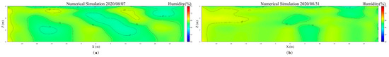 The humidity contour maps of the grain pile’s XOZ plane. (a) 7th day; (b) 31st day.