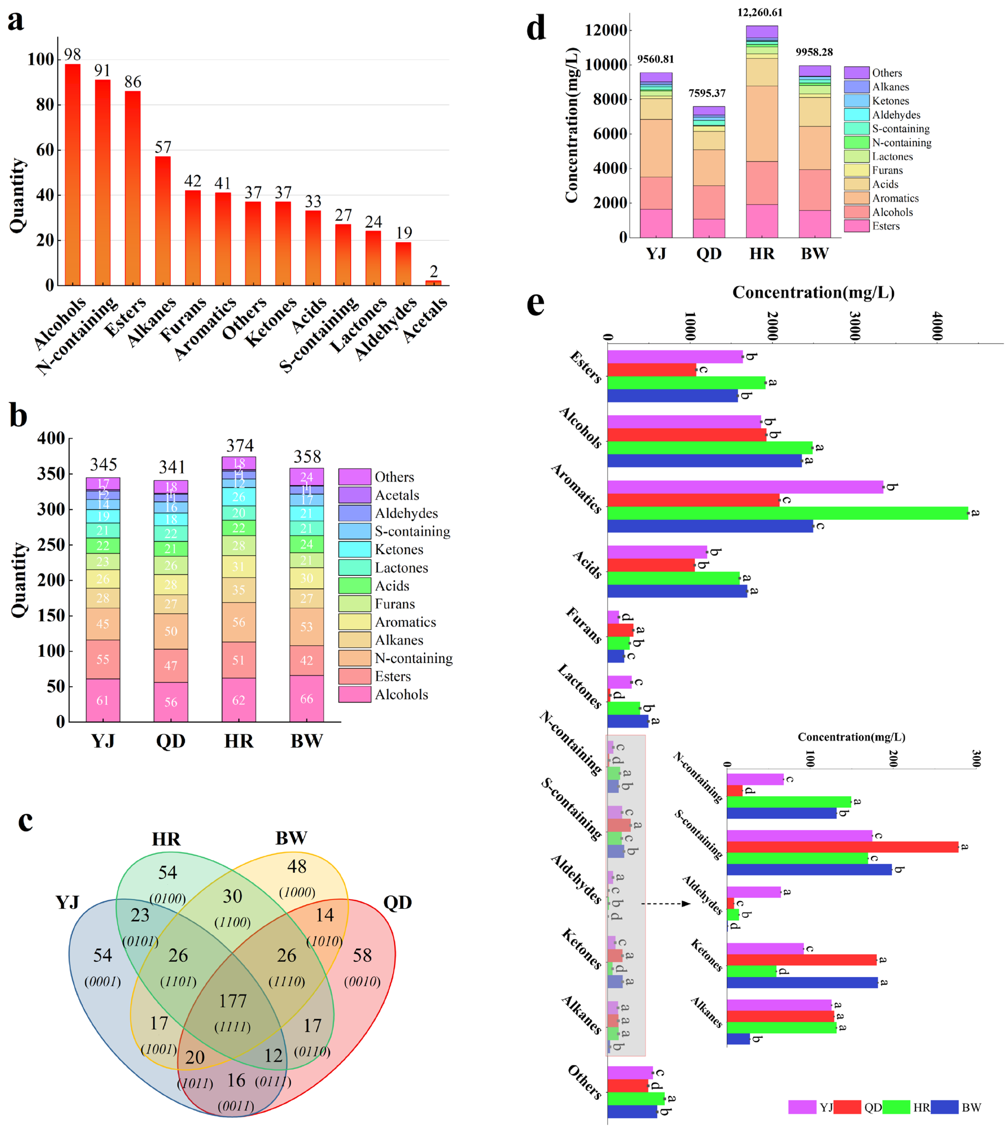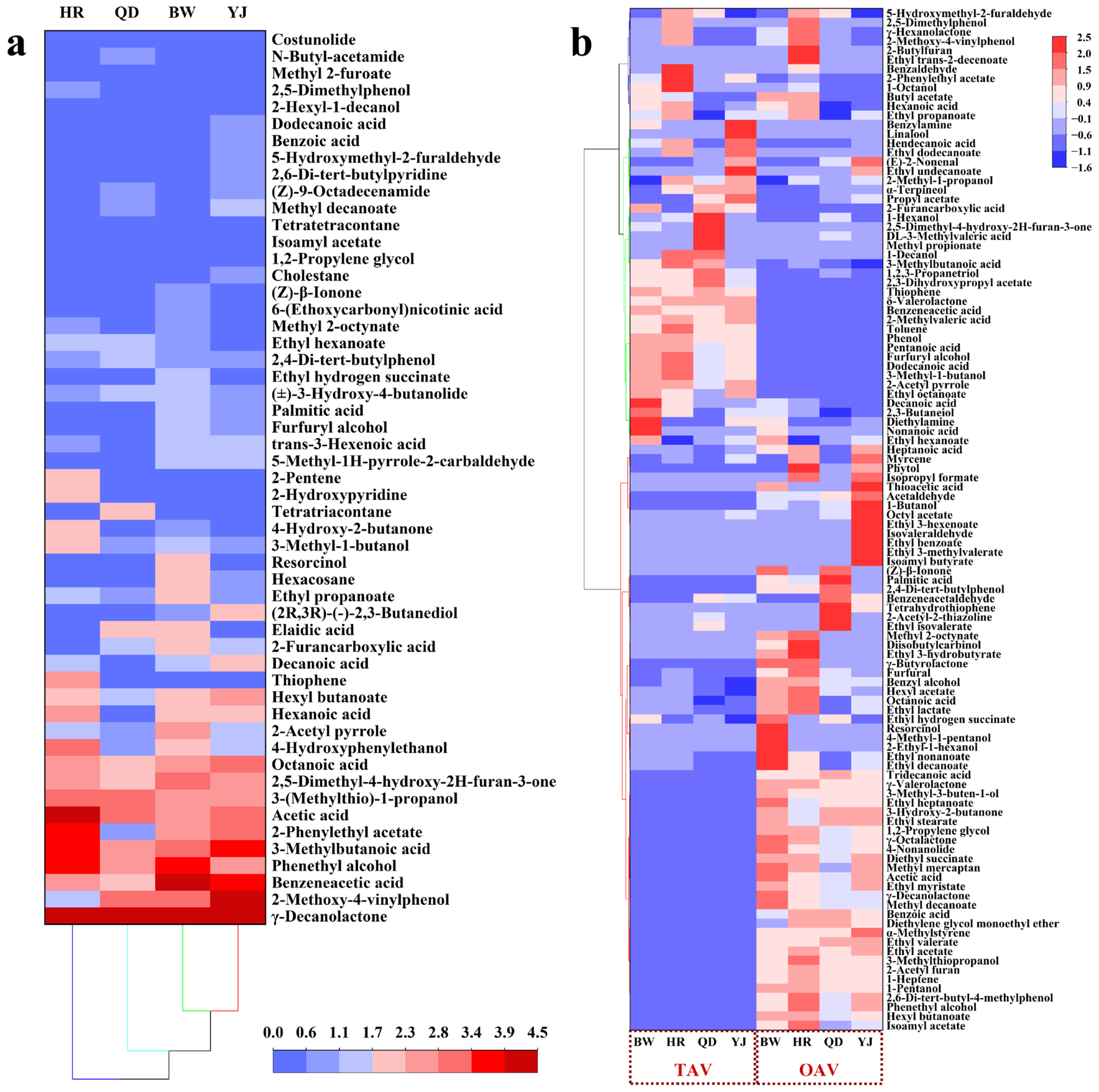 - Chen, Y.; Xie, J.; Yuan, X.; Zhang, C.; Hong, J.; Zhao, Z.; Zhao, D.; Sun, B.; Wang, S.; Sun, J.; et al. Flavoromics-based profiling of flavor compound dynamics across the strong-flavor Baijiu production chain. J. Food Compos. Anal. 2025, 148, 108132. [Google Scholar] [CrossRef]