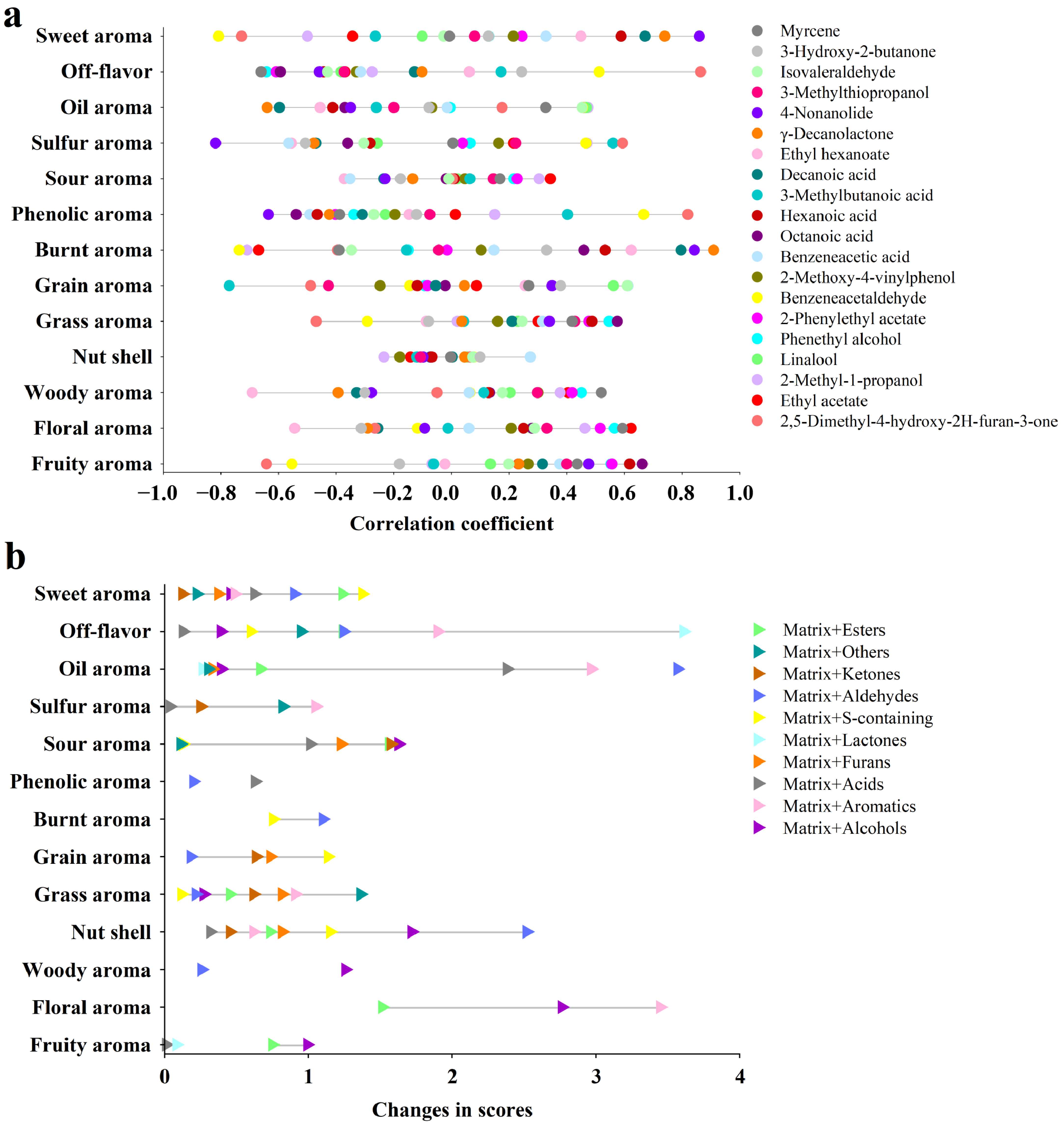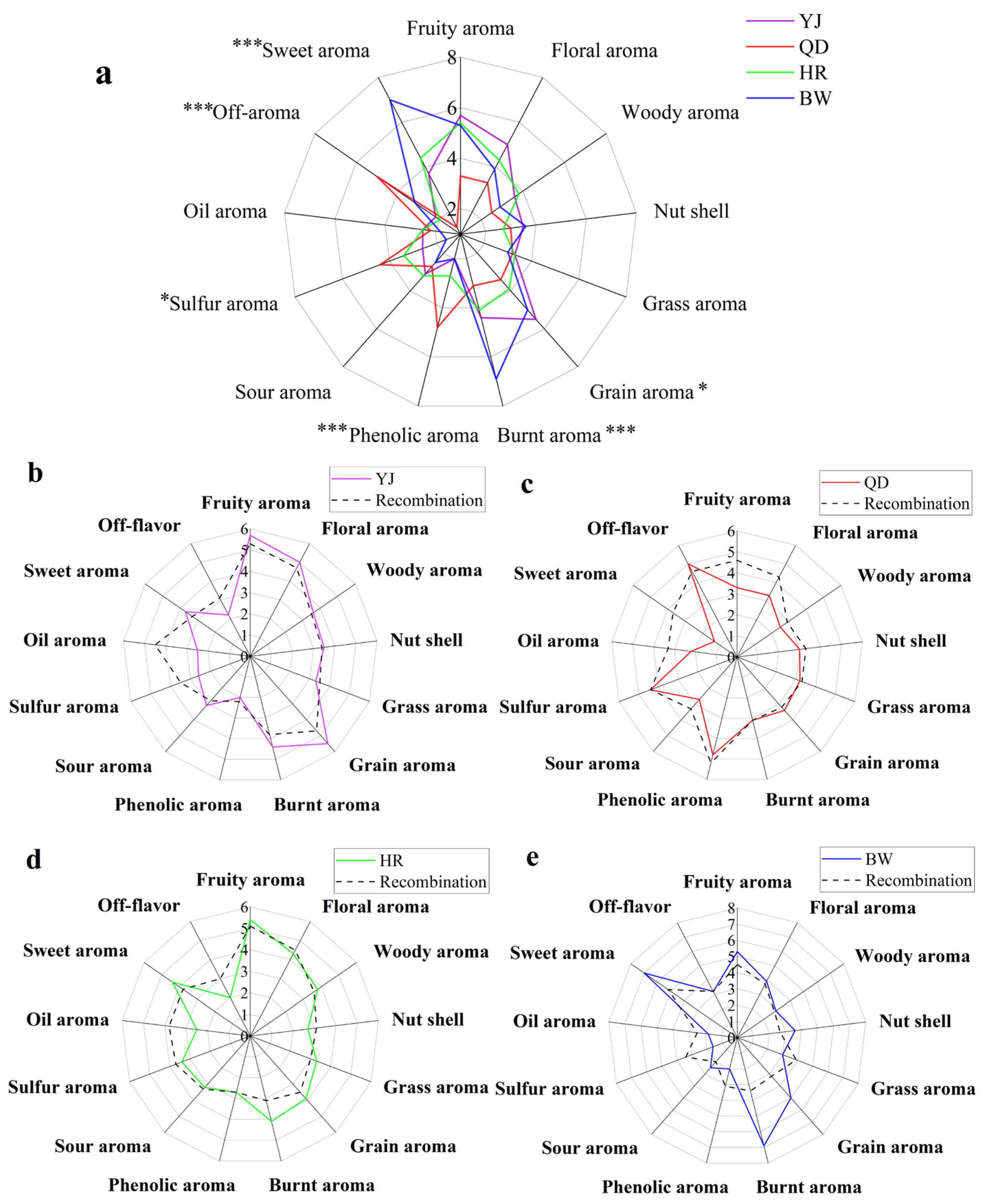 - Yang, Q.; Liang, N.; Chen, S.; Chen, J.; Chen, M.; Tu, J.; Xiang, Z. Unravelling the key flavor components of beer based on a new online recombination olfactometry of mixed targeted compounds. Food Chem. 2025, 479, 143702. [Google Scholar] [CrossRef]