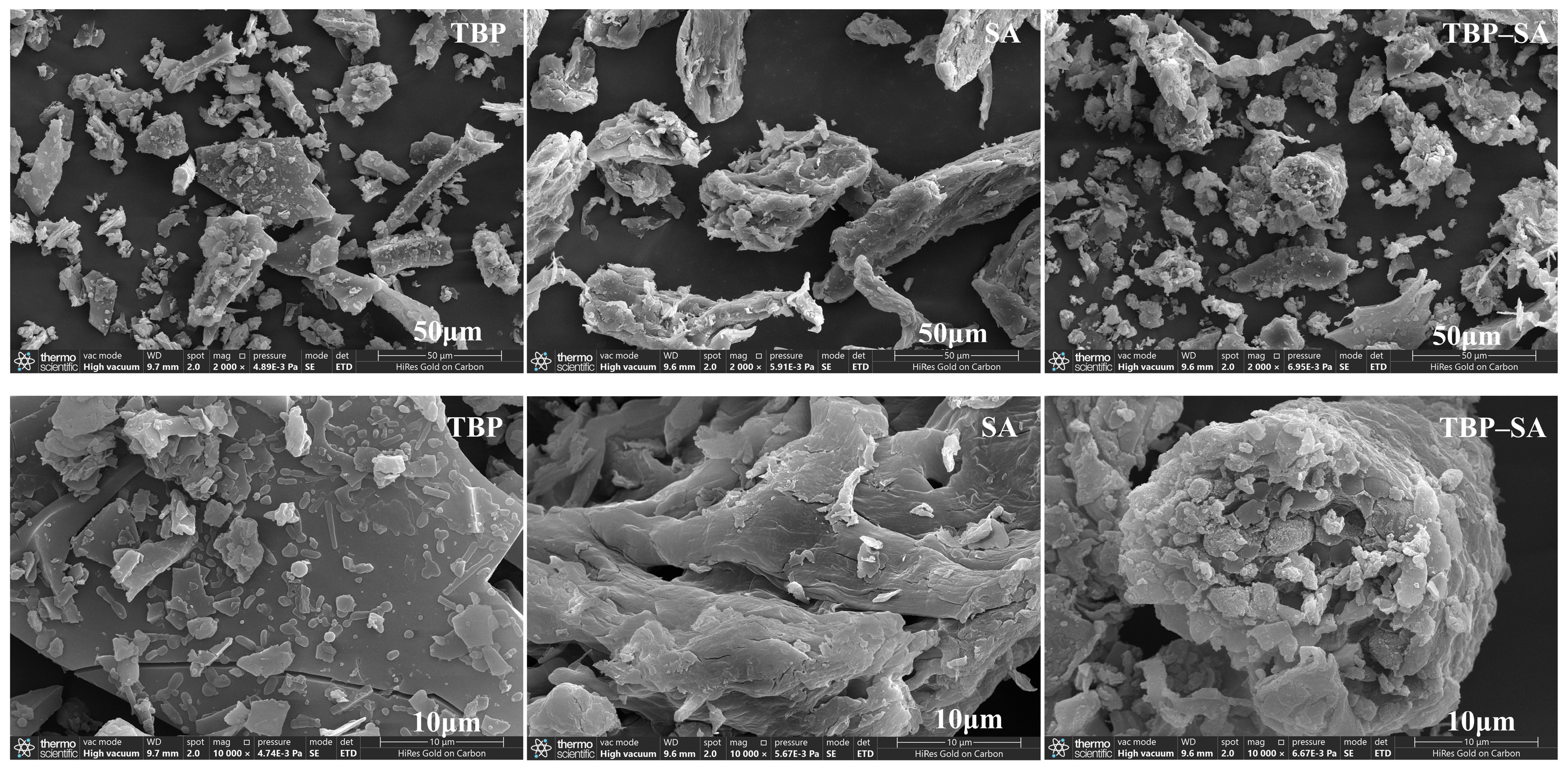 2.8. Scanning Electron Microscopy (SEM) Observation of TBP–SA