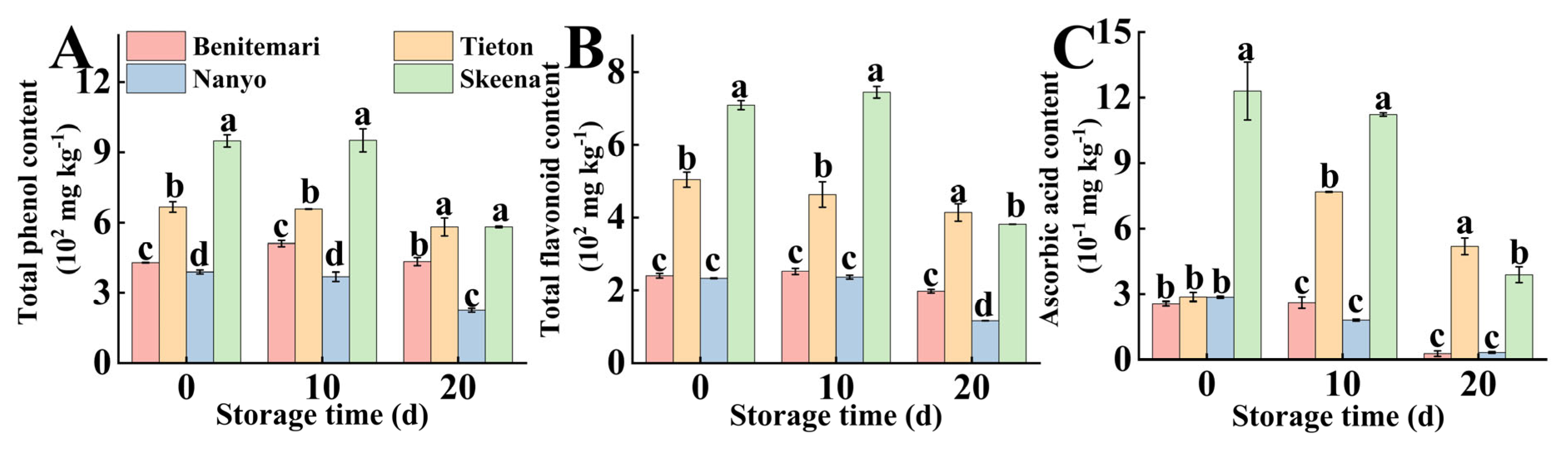 Figure 2. Changes in Total phenolic contents (A), Total flavonoids contents (B), and Ascorbic acid content (C) of four different cultivars of cherry during storage at 0 °C for 20 days. Vertical bars represent the standard error of the means. Different letters indicate significant differences (ANOVA, p < 0.05) between four different cultivars of cherry on the same day.