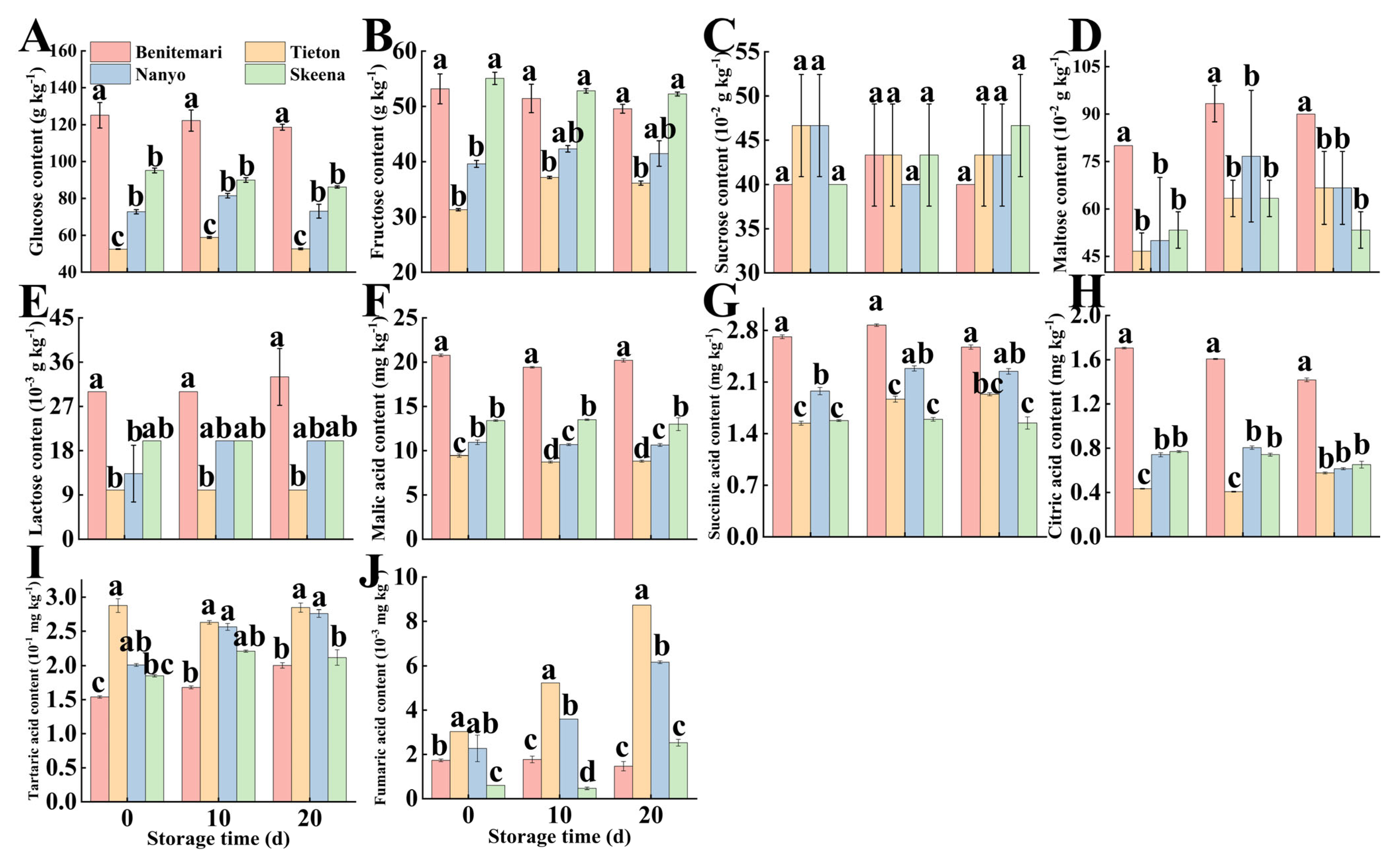 Figure 3. Changes in glucose content (A), Fructose content (B), Sucrose content (C), Maltose content (D), Lactose content (E), Malic acid content (F), Succinic acid content (G), Citric acid content (H), Tartaric acid content (I), Fumaric acid content (J) of four different cultivars of cherry during storage at 0 °C for 20 d. Vertical bars represent the standard error of the means. Different letters indicate significant differences (ANOVA, p < 0.05) between four different cultivars of cherry on the same day.