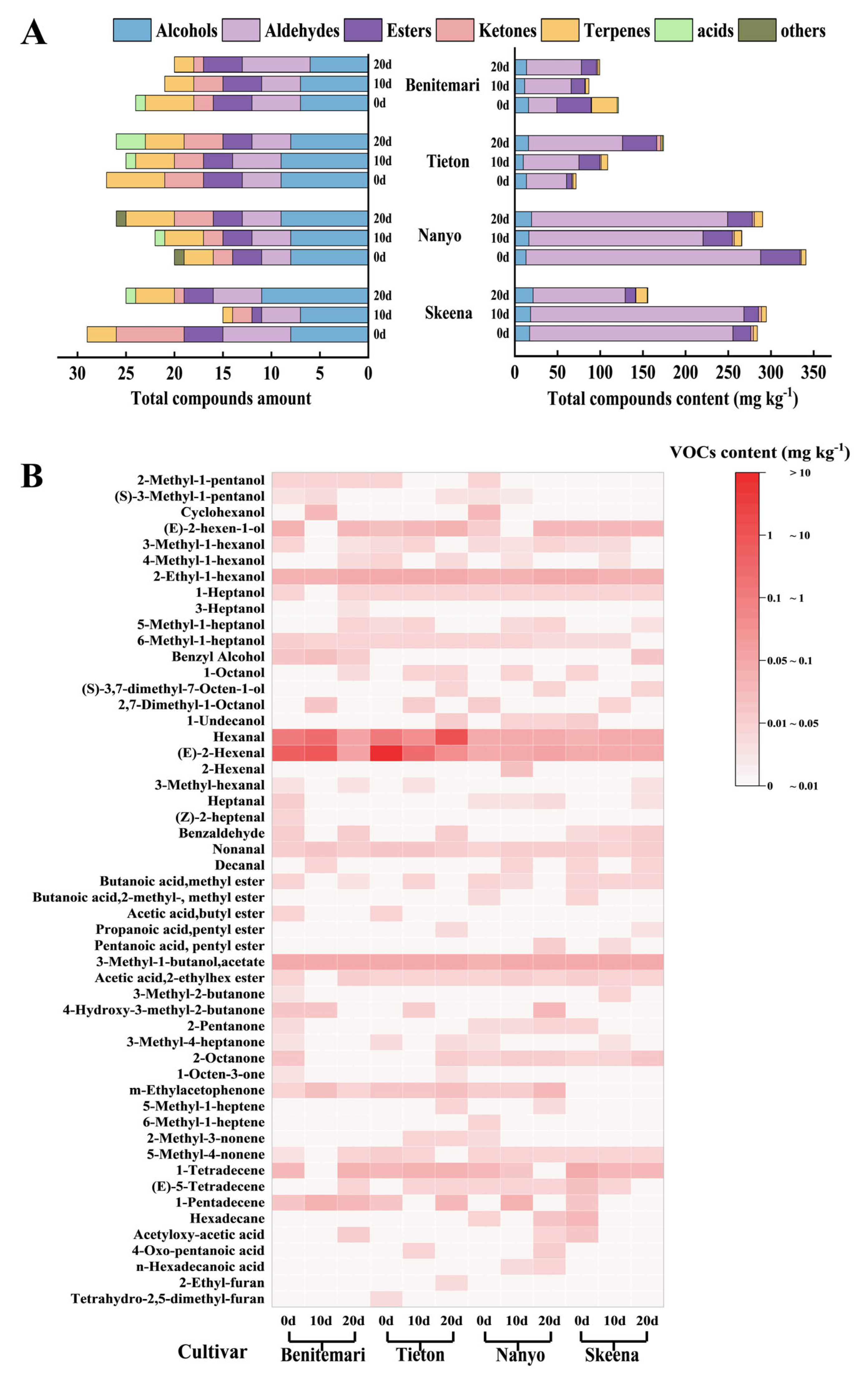 Figure 4. Changes in total volatile compounds amount and total volatile compounds concentration (A) and Heat map volatiles concentration (B) of four different cultivars of cherry during storage at 0 °C for 20 d.