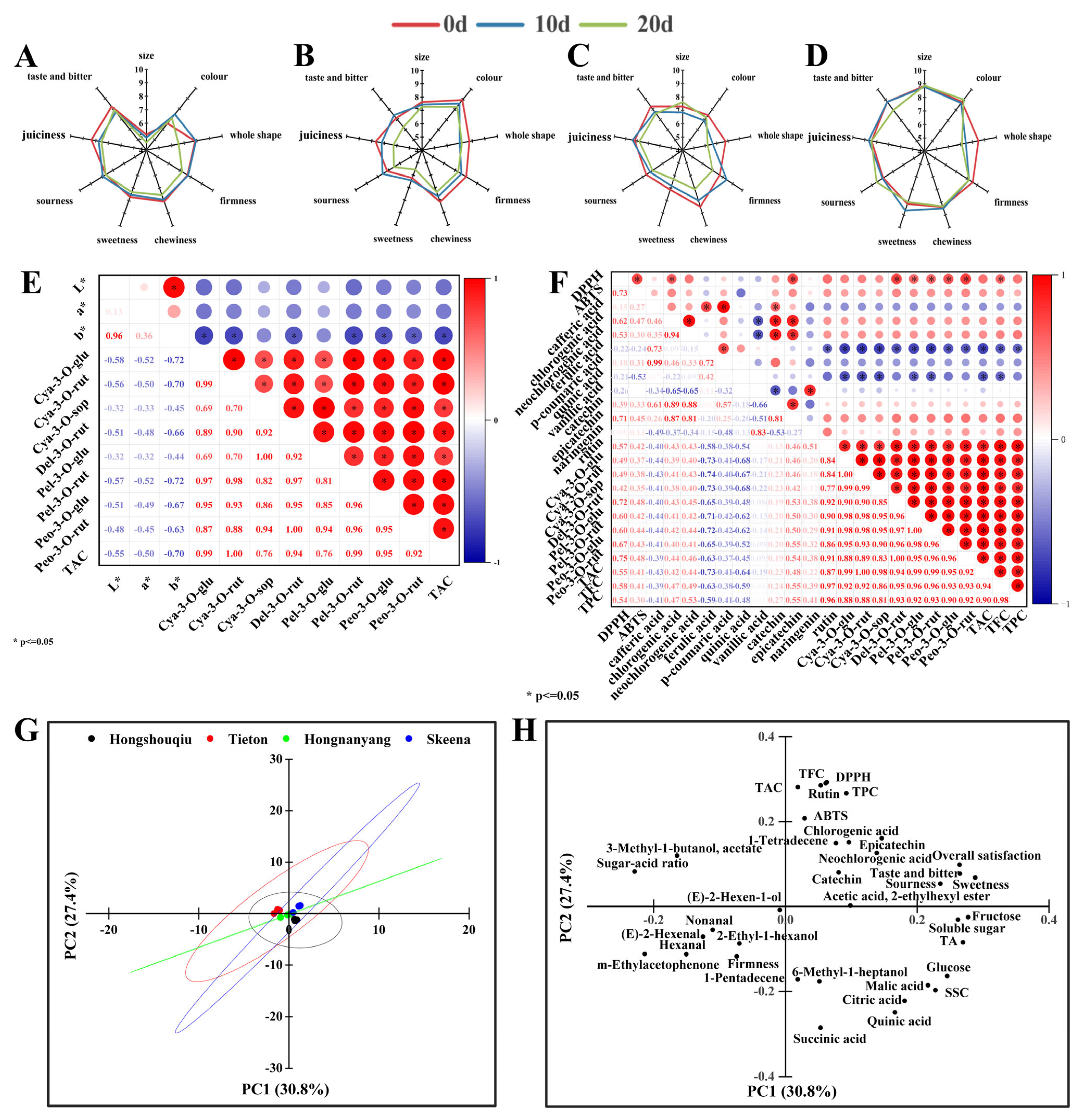 Figure 5. Sensory evaluation score radar map of ‘Benitemari’ (A), ‘Tieton’ (B), ‘Nanyo’ (C), ‘Skeena’ (D), Correlation analysis of color and anthocyanin content (E), Antioxidant activity and polyphenols (F), Score plot of cherries samples (G), Loading of variables (H) by the dimensions 1 and 2 from Principal component analysis of four different cultivars of cherry during storage at 0 °C for 20 d.