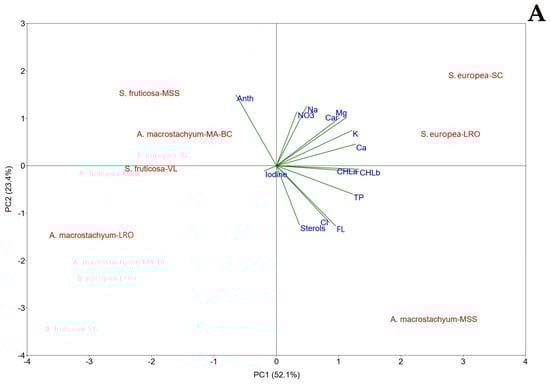 Chlorophyll levels (CHLa, CHLb) in S. europaea and A. macrostachyum-MSS were significantly higher (more than 10 times) than in other collected glassworts (Table 3). Carotenoid concentrations were also elevated in S. europaea, particularly in the commercial farm sample (S. europaea-SC), followed by S. fruticosa-MSS. Total phenol (TP) content in S. europaea and A. macrostachyum-MSS was approximately 4.5 times higher than that in the other samples. Higher variability was detected for flavonoids (FL) with A. macrostachyum-MSS having the greatest amount. FL concentration was halved in S. europaea and decreased to about one-fourth in other A. macrostachyum genotypes, whereas negligible was the level of FL in S. fruticosa-MSS (Table 3). Anthocyanin content fluctuated, with clear differences observed between S. fruticosa-MSS (higher values) and A. macrostachyum-MSS (Table 3). Sterol concentration in A. macrostachyum-MSS was 3.6-fold higher than in A. macrostachyum-MA-BA, S. fruticosa-VL and S. europaea-SC. The glasswort of Laguna del Re Oasis (LRO) had very low sterol levels (Table 3).