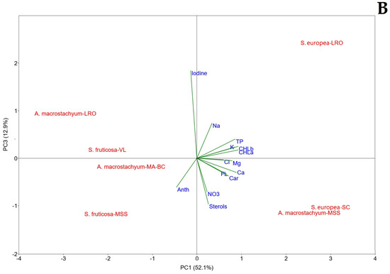 The principal component analysis (PCA) was performed using the PAST3 Software (http://folk.uio.no/ohammer/past, accessed on 22 July 2025) on mean standardized data. The data standardization was performed using the formula: (x-mean)/standard deviation. The data matrix considered all glasswort collected samples with relative replications.
