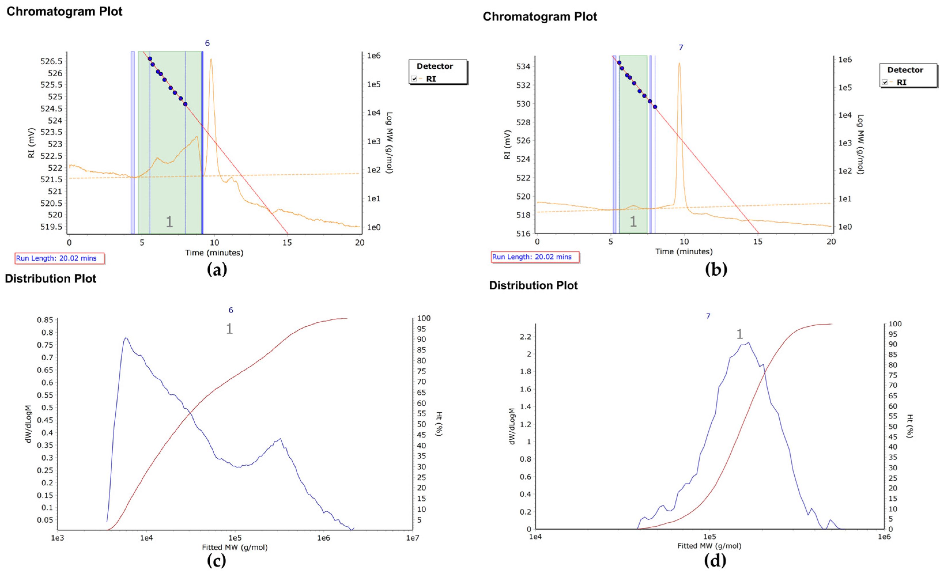 All experiments were conducted in triplicate, and the data are presented as mean values. A one-way analysis of variance (ANOVA) was performed using SPSS software 22.0 (International Business Machines Corporation, New York, NY, USA), with the significance threshold set at p < 0.05. Zeta potential values were calculated according to the Smoluchowski model and are reported as the average of three consecutive measurements. Molecular weight and polydispersity index were determined by GPC relative to polystyrene standards. All spectral data were processed using the software (Agilent GPC/SEC software) provided by the manufacturer.