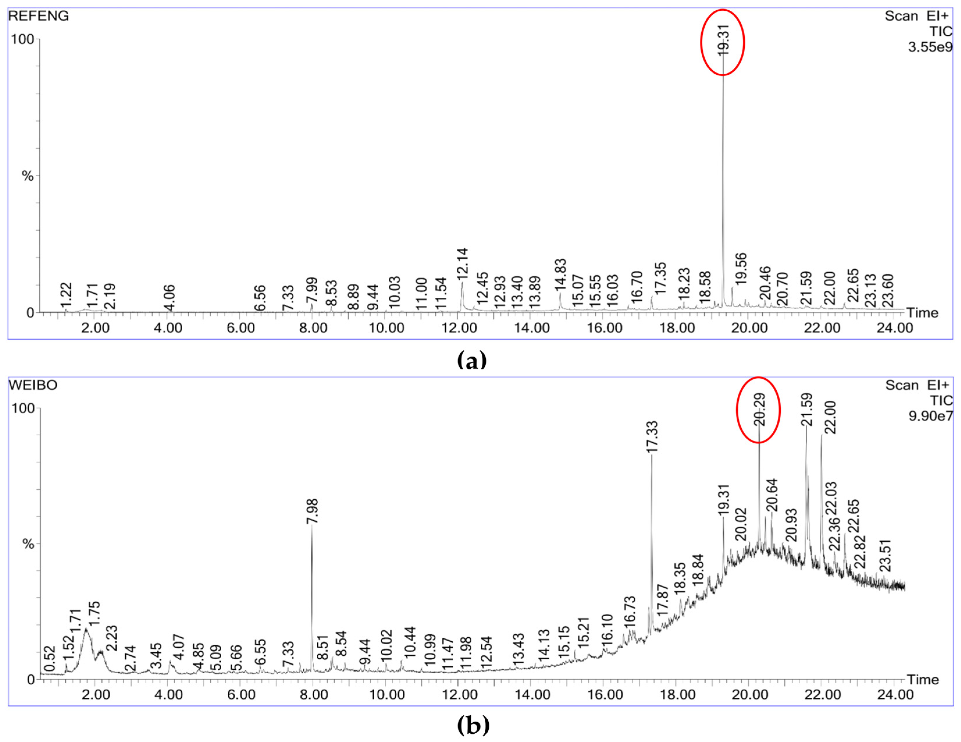 Figure 2. GC-MS chromatograms of hot air (a) and microwave (b) drying of soluble dietary fiber.