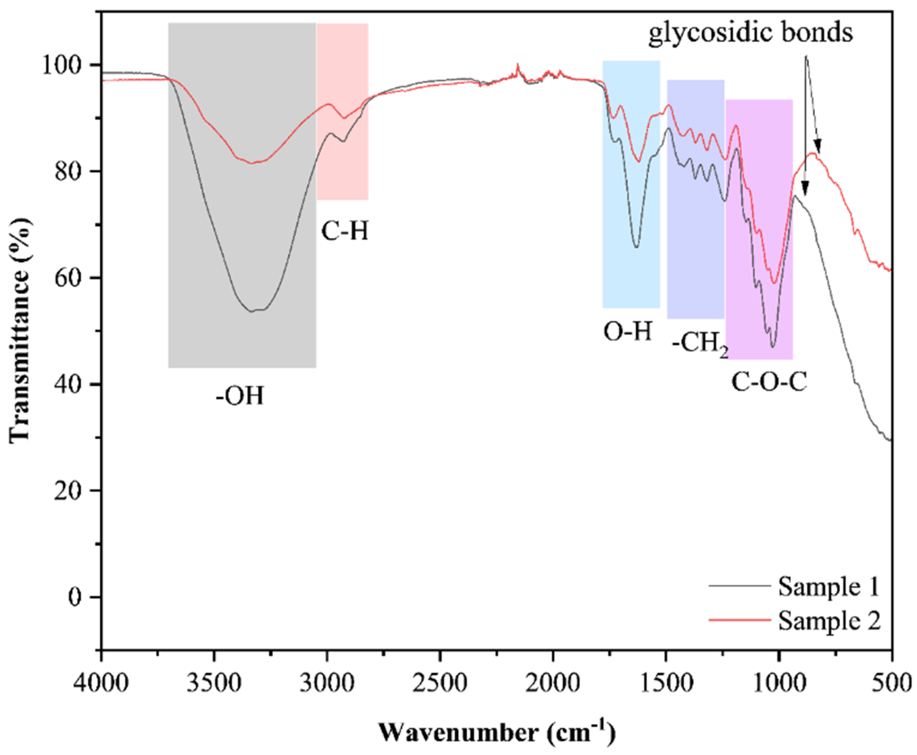 Figure 3. FT-IR spectra showing functional groups and glycosidic linkages in soluble dietary fiber. Sample 1 and 2 indicate hot air and microwave drying, respectively.