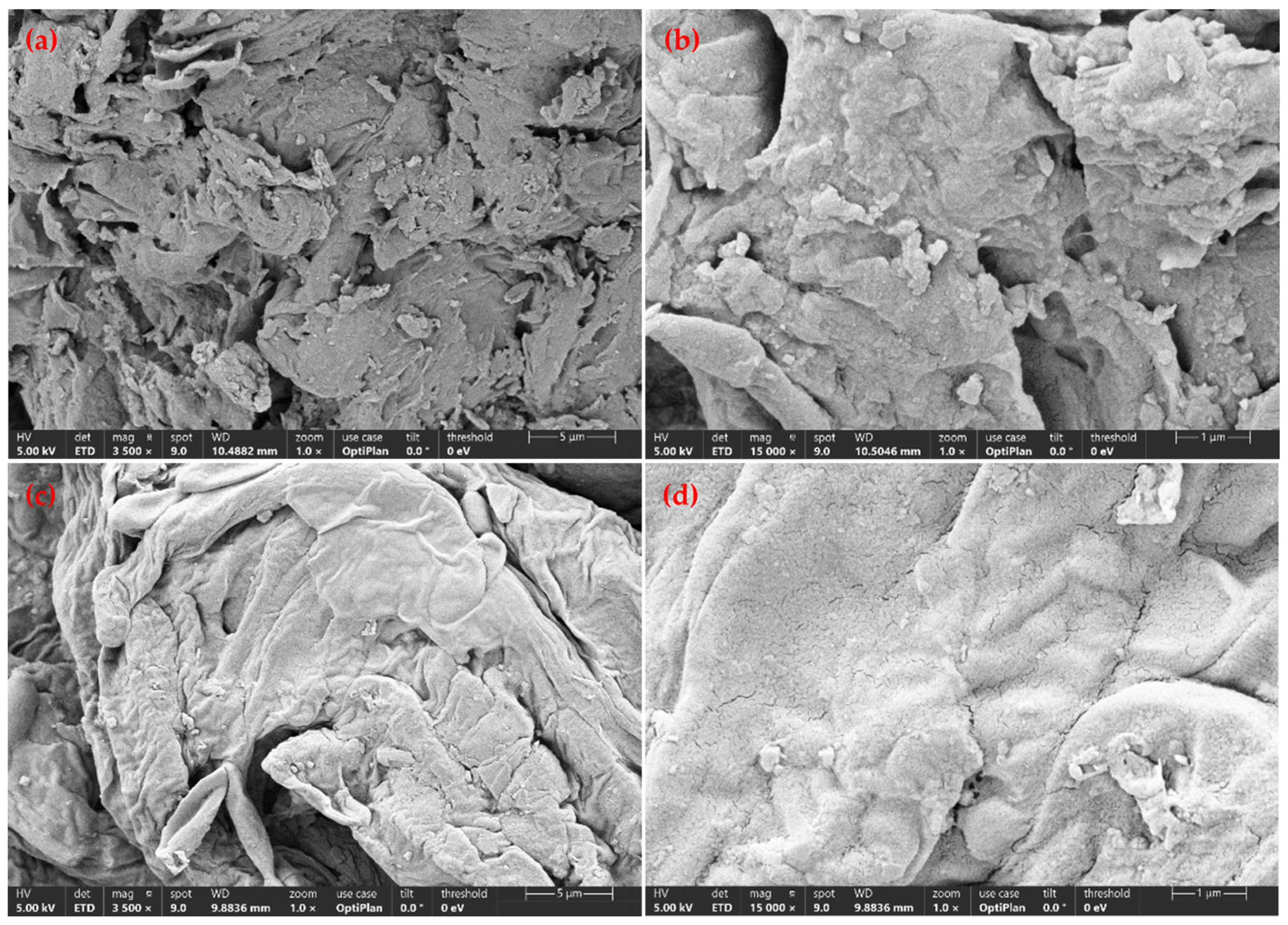 The microstructural characteristics of SDF, which significantly influence its porosity and surface properties [37], were examined using SEM. A comparative analysis of HD- and MD-SDF revealed distinct morphological differences. As depicted in Figure 4a,b, the HD sample exhibited a compacted and contracted morphology. The intrinsic cellular honeycomb or porous architecture of HD-SDF was extensively compromised and collapsed, resulting in reduced porosity [38]. During HD, thermal energy is transferred from the surface inward, causing premature surface moisture evaporation and the formation of a rigid crust. This process impedes internal moisture migration, leading to insufficient internal steam pressure and ultimately causing structural collapse and adhesion mediated by surface tension and capillary forces [39]. In contrast, the MD sample demonstrated an open, highly porous, three-dimensional structure (Figure 4c,d). The structural integrity of MD-SDF was notably preserved, with significantly reduced shrinkage compared to the HD sample. This outcome is attributed to the rapid and volumetric heating provided by microwave energy, which induces instantaneous vaporization of internal moisture. The resulting buildup of internal steam pressure exceeds the mechanical strength of cell walls, leading to rupture and the formation of an interconnected porous network [40]. This highly porous structure suggests a substantially increased specific surface area, which predicts superior rehydration performance, crisp textural attributes, and rapid dissolution [22]. Conversely, the dense morphology of HD samples may require greater masticatory effort and exhibit delayed rehydration.
