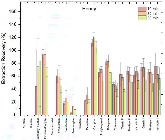 Recovery (%) of 20 biopesticides from honey matrix using ChClBt (1:4, molar ratio) at different extraction times (10, 20, and 30 min) in honey; error bars indicate relative standard deviation (n = 3).