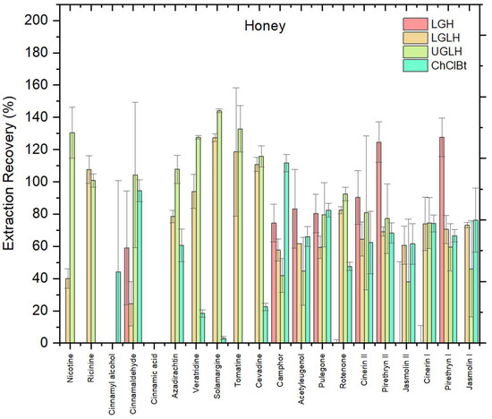 Recovery (%) of 20 biopesticides from honey matrix using four different NADES: LGH, LGLH, UGLH, and ChClBt in honey; error bars indicate relative standard deviation (n = 3).
