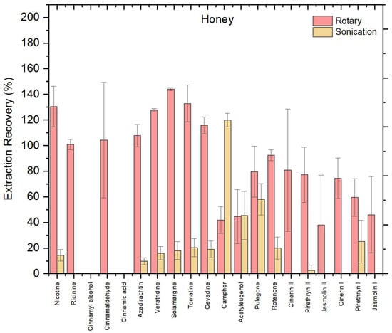 Recovery (%) of 20 biopesticides from honey matrix using the optimal UGLH, comparing rotary mixing and sonication in honey; error bars indicate relative standard deviation (n = 3).