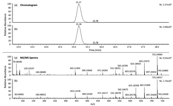 UHPLC-Q-Orbitrap chromatogram and MS/MS spectra of (a) standard of azadirachtin at 500 µg/L and (b) azadirachtin (500 µg/kg) after extraction with UGLH (1:1:2, molar ratio).