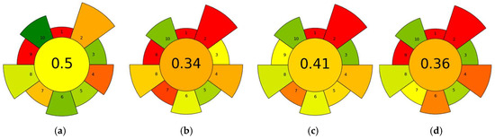 AGREEprep score for (a) NADES-based extraction method (this study), (b) QuEChERS method [44], (c) RAM-MISPE method [42], and (d) LLE method [43]. Pictograms showed the ten evaluation criteria (1–10) defined by the AGREEprep software. Colors represent the relative performance of each criterion, from green (more sustainable) to red (less sustainable).