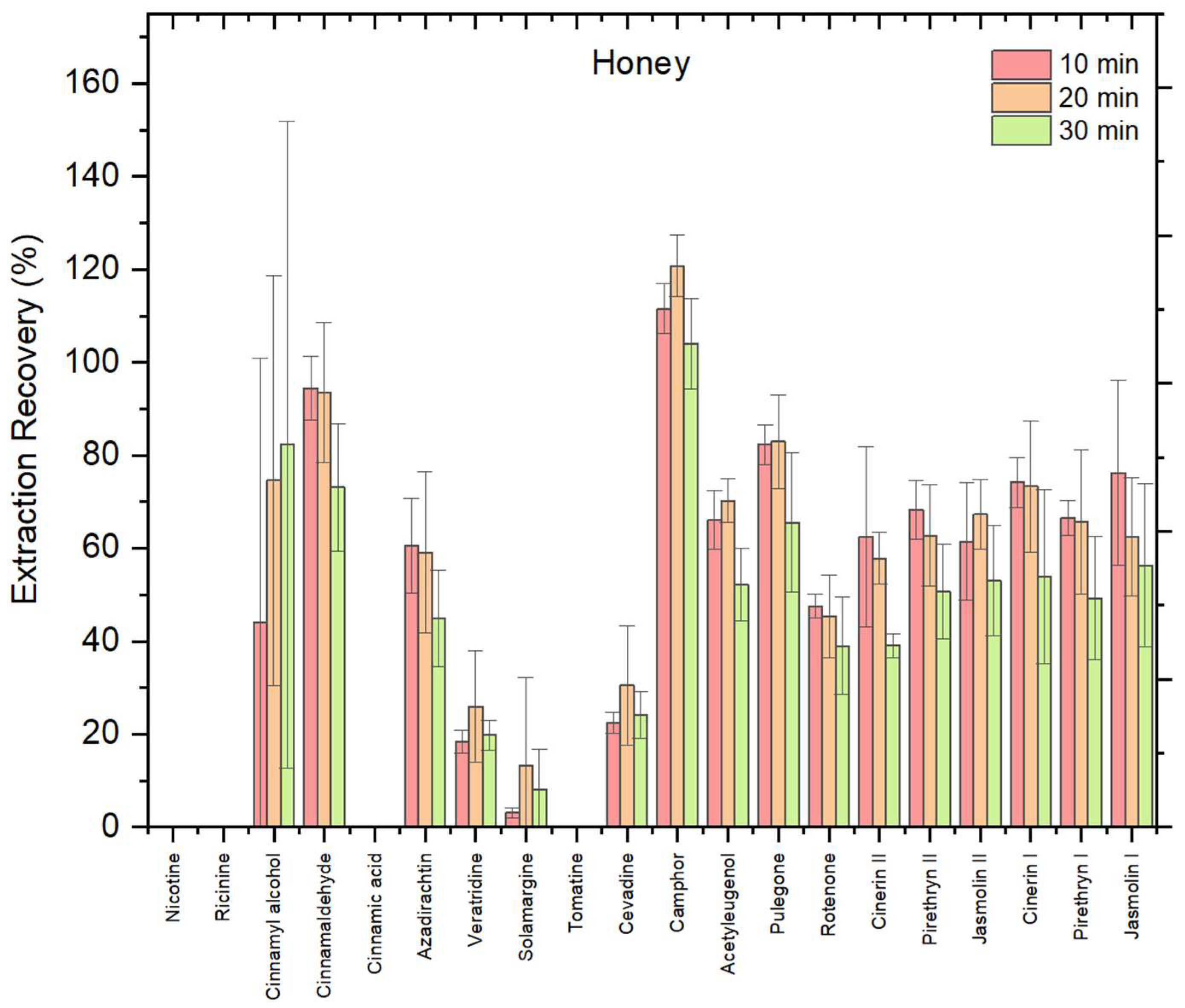 3.2. Validation of Biopesticide Extraction from Honey Matrix