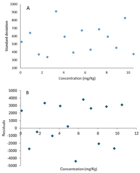 The initial step in method development and validation is to ensure that the theoretical model fits on the calibration curve, generally linear when a short concentration range is employed, but quadratic when working with a concentration range of 2–3 orders of magnitude. A linear model can be adjusted by ordinary least squares regression (OLS) or weighted least squares regression (WLS); the choice of one or the other will depend on the homoscedasticity of the variable errors (variances). Homoscedasticity can be evaluated using the residual plot, a standard deviation graph, and the F test [29]. The model selection (OLS or WLS) was performed with the calibration curves obtained by external matrix-matched standard calibration.