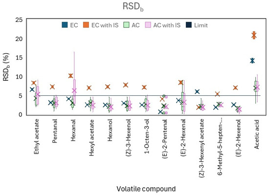 Additionally, different parameters (calibration curve equation, R2, RSDb, and sensitivity) were evaluated for the four methodological calibrations (Table S1). For the coefficient of determination (R2), even though it should not be the only parameter to base our analysis on, it is interesting to have a preliminary idea of the linear fitting. Three calibrations showed values over 0.98, with no significant (p < 0.05) difference between them, highlighting the good linear modeling of the different calibrations. However, the EC with IS showed in all cases (except (Z)-3-hexenyl acetate) a lower R2, being two calibrations below 0.98. In certain chemicals, such as hexanal or (E)-2-hexenal, these differences are significant (p < 0.05), shedding light on the fact that the employment of an internal standard could not be beneficial for the quantification of volatiles in these kinds of matrices; however, the rest of the parameters need to be evaluated to reach this conclusion. Additionally, as in the study of linearity, acetic acid showed the worst R2 in comparison to the rest of the chemicals, but the EC with IS still showed the lowest value (0.9270).