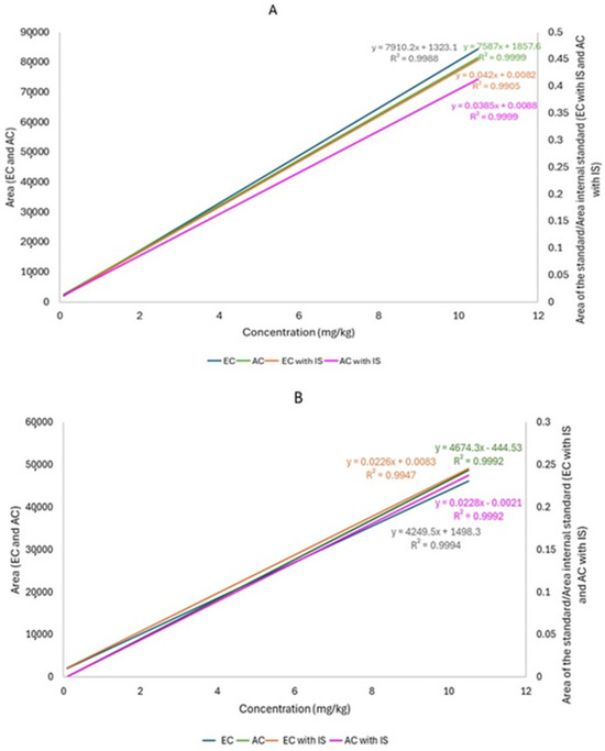 The sensitivity (slopes of the calibration curves) for the different chemicals showed significant differences (p < 0.05) between the calibrations that either employed or did not employ an internal standard (IS) (Table S1). Figure 3 shows that, in the calibrations without the IS, the Y axis (left) represents the area (order of magnitude between 3 and 5), whereas, in the calibrations with the IS, the secondary Y axis (right) represents the ratio between the analyte standard area and the area of the IS (order of magnitude between −2 and −1). Thus, the difference between the order of magnitude makes it difficult to compare the different analytical curves and the sensitivity because it is related to the slope. However, when comparing the sensitivity of EC/AC and EC with IS/AC with IS, no significant differences (p < 0.05) were observed, although the AC calibrations showed higher standard deviations, similarly to what was observed for RSDb.