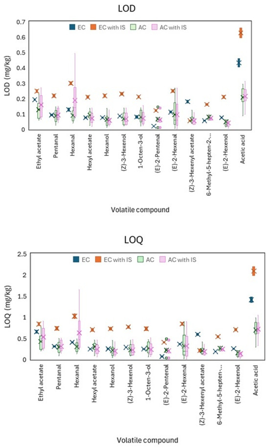 The limits of detection and quantification (LOD and LOQ, respectively) were determined, and both presented a similar behavior to that observed in RSDb (Table S1). Figure 4 shows the results obtained, and it can be seen that external standard calibration (EC) showed the least error and similar values to AC and AC with IS, the LOD ranging from 0.02 mg/kg ((E)-2-pentenal) to 0.43 mg/kg (acetic acid) and the LOQ ranging from 0.07 mg/kg to 1.42 mg/kg for the same compounds. The calibration that showed the highest LOD and LOQ values was the external standard with internal standard calibration (EC with IS), highlighting that the use of internal standards did not improve the methodology for quantifying volatiles in oily matrices. Furthermore, as for RSDb, the LOD and LOQ were also affected by the increase in the number of analyses for the calibration curves in the standard addition calibrations. Additionally, and following the previous trends observed, acetic acid showed the highest values of LOD and LOQ in all the calibrations. These results are in contrast with other values reported previously [27], but the difference could be due to the employment of a different preconcentration step (DHS against SPE).