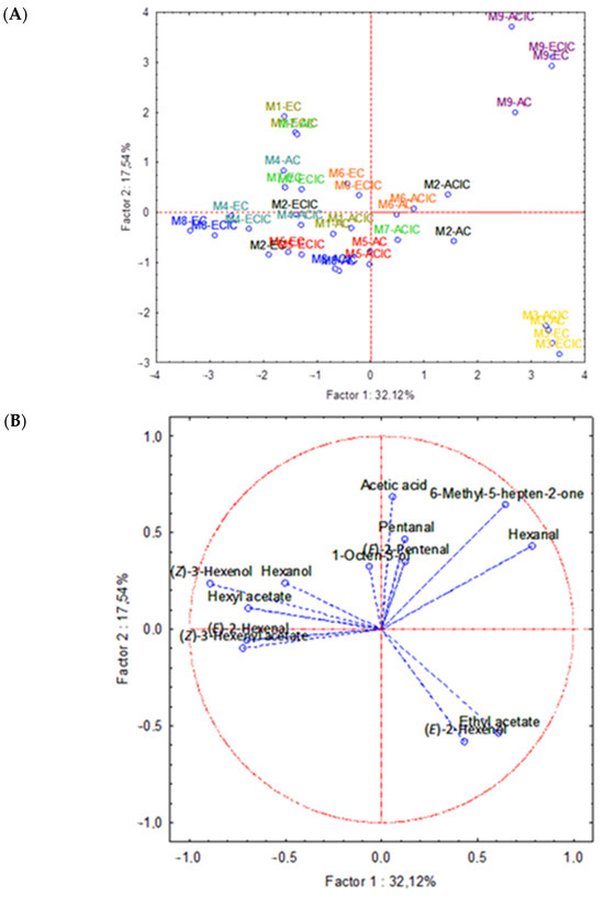 Figure 5B shows the scores and highlights that sample M9 (lampante) is strongly influenced by hexanal and 6-methyl-5-hepten-2-one, whereas sample M4 (EVOO) is separated due to ethyl acetate and (E)-2-hexenal. The rest of the samples are more or less influenced by the other volatiles, such as M8 (lampante), which is influenced by hexyl acetate or (Z)-3-hexenyl acetate.