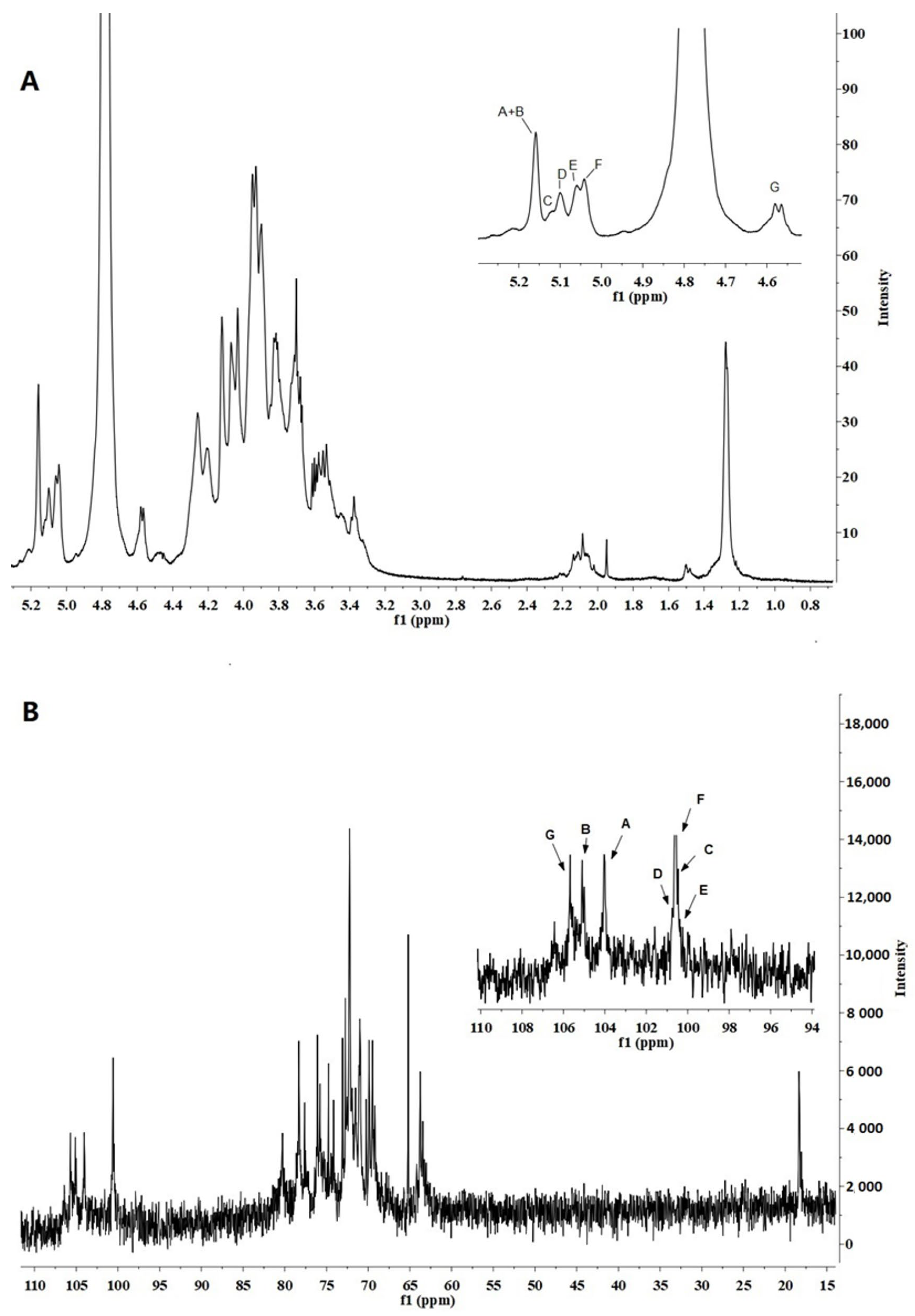 F α-Manp (1→ | 5.06(H-1) | 3.54(G:H-3), 3.74(F:H-4), 3.90(F:H-2), 4.08(F:H-5), 4.27(F:H-3) |