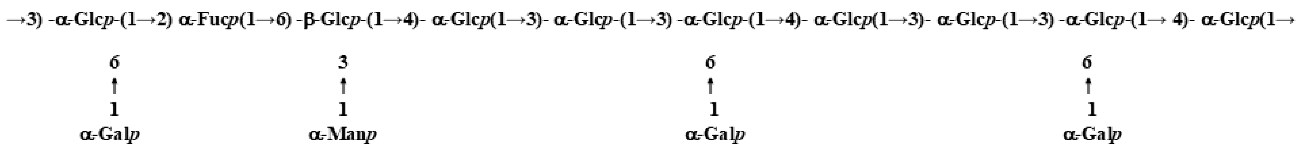 B →4)-α-Glcp (1→ | 5.16(H-1) | 3.70(C:H-3), 4.05:(D:H-3), 3.94(B:H-3), 4.14(B:H-2) |