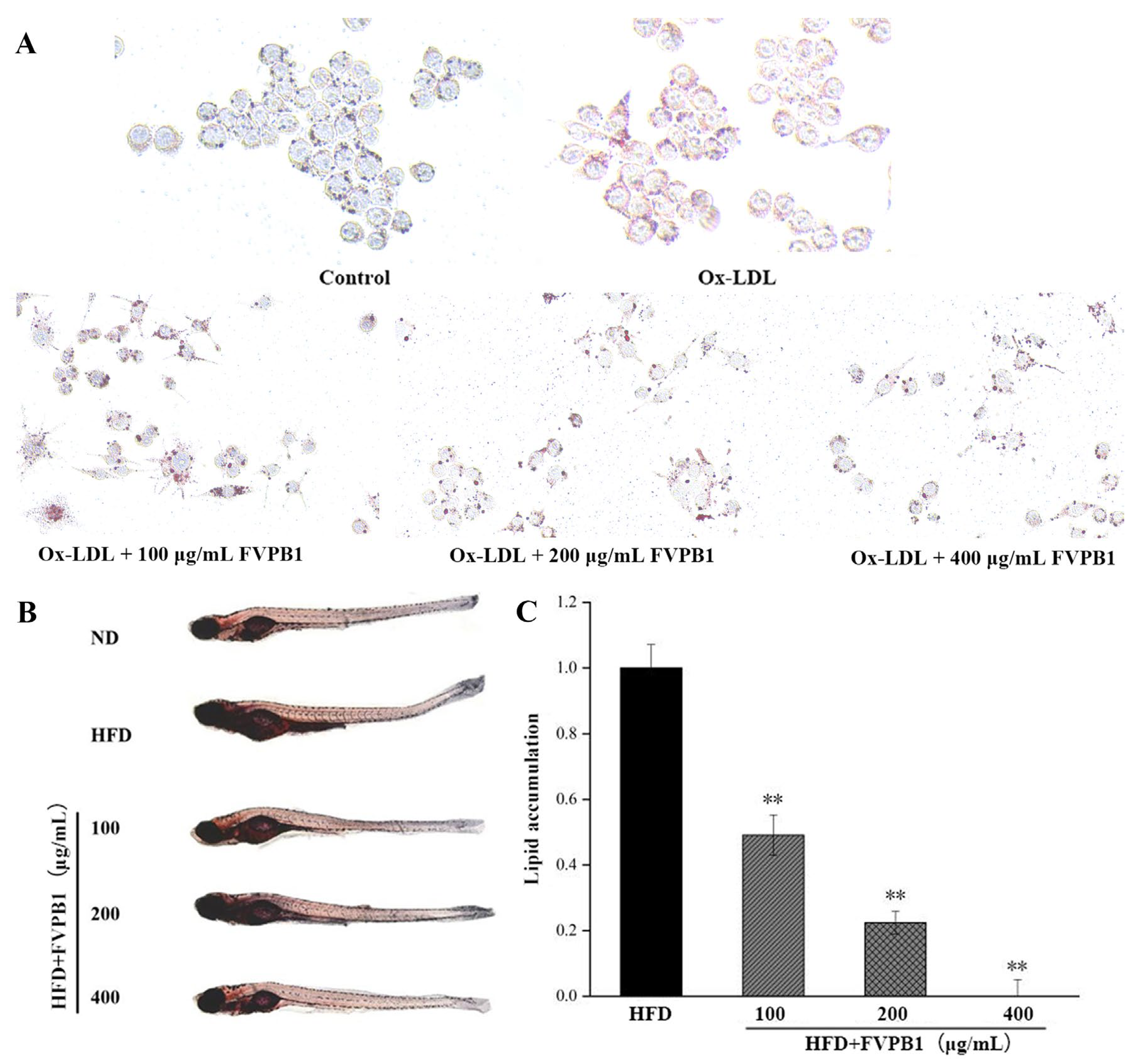 3.2. FVPB1 Inhibits Lipid Accumulation in RAW264.7 Cells and HFD-Induced Zebrafish Larvae