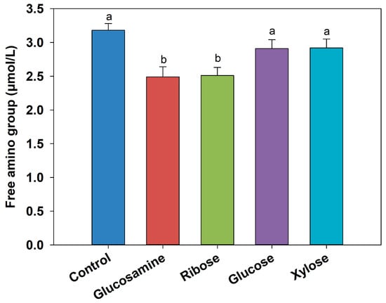 The changes in free amino groups in MRPs from different reducing sugars. Different letters between each group indicate significant differences between treatments (p < 0.05).