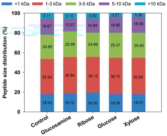 The changes in MW can indicate the degradation and crosslinking of peptides during the Maillard reaction. Figure 2 illustrates the changes in MW distribution of FSCPs during the Maillard reaction. In the control group, the peptide fractions with MW > 10 kDa, 5–10 kDa, and 3–5 kDa accounted for 5.11%, 16.67%, and 24.65%, respectively, while those <3 kDa represented the highest proportion at 53.57%. The abundance of low-MW peptides and amino acids served as a foundation for further Maillard reactions and could also accelerate their progression. After reacting 6 h hydrolysate with the four different reducing sugars, the proportion of high-MW peptides slightly decreased, likely due to heat-induced degradation of high MW peptides. Among them, the most pronounced reduction was observed in the glucosamine group, where the proportion of high-MW components decreased by 3.31%. Conversely, the proportion of low-MW peptides and amino acids increased slightly, with the ribose group showing the largest increase at 1.47%, indicating that the degradation of larger peptides exceeded that of smaller ones. These findings are consistent with the study by Yu et al. [], in which the Maillard reaction occurred between glucosamine and fish viscera peptides, leading to a significant decrease in the proportion of peptide fraction > 5 kDa, from 38.62% to 8.16%, while those <1 kDa increased from 1.31% to 6.24%.