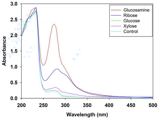 UV scanning is a widely used method to monitor and characterize the progress of the Maillard reaction [,]. The absorbance at 320 nm typically reflects the formation of intermediate Maillard reaction products, while the absorbance at 420 nm is commonly used to indicate the formation of advanced Maillard reaction products such as melanoidins []. As shown in Figure 3, the MRPs from all four reducing sugars exhibited higher absorbance than the control group in the range of 320–420 nm. Notable differences were also observed in the region between 280 and 294 nm, suggesting the formation of certain intermediate compounds during the reaction. Specifically, the peak near 280 nm is associated with the generation of sugar condensation products and the presence of aromatic amino acids [], while the absorbance at 294 nm corresponds to the formation of dicarbonyl compounds such as ketones and aldehydes during the Maillard reaction []. Among all groups, the MRPs derived from glucosamine exhibited the highest absorbance in the region of 280–294 nm, confirming that glucosamine induced the production of more intermediate compounds during the Maillard reaction.