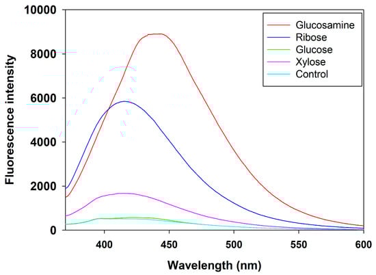 Fluorescence scanning spectra of MRPs from different reducing sugars.