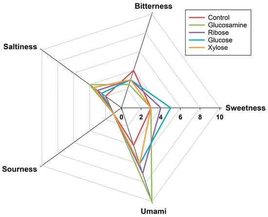 The sensory profiles of FSCPs without sugar and MRPs derived from xylose, glucosamine, glucose, and ribose were evaluated by a trained sensory panel. As shown in Figure 5, the bitterness intensity followed the order: native FSCPs (4.0) > ribose-MRPs (3.0) = glucose-MRPs (3.0) = xylose-MRPs (3.0) > glucosamine-MRPs (2.5). These results indicated that the Maillard reaction reduced the overall bitterness and fishy odor of FSCPs to varying degrees [], with glucosamine-MRPs exhibiting the most significant reduction in bitterness compared to the control. For umami taste, the scores were glucosamine-MRPs (10.0) > ribose-MRPs (7.0) > glucose-MRPs (6.0) = xylose-MRPs (6.0) > FSCPs without sugar (4.0). The glucosamine-MRPs showed the highest umami intensity, suggesting that the sample not only has a more pronounced umami taste but also the strongest umami-enhancing effect []. Regarding saltiness, glucosamine-MRPs scored 4.0, followed by xylose-MRPs (3.5), ribose-MRPs (3.0), glucose-MRPs (2.5), and FSCPs without sugar (2.0). The increase in saltiness score from 2.0 (control) to 4.0 (glucosamine group) further confirmed the salt-enhancing capability of glucosamine-induced MRPs. However, no significant improvement was observed in sweetness and sourness across all groups.