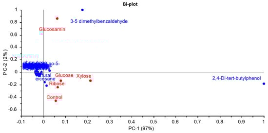 PCA bi−plot of volatile compounds from MRPs of different reducing sugars.