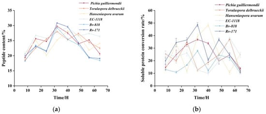 Different fermentation strains yield distinct fermentation results (Figure 1a). Among the six yeast strains, RV-171 exhibited the most effective fermentation, achieving the highest peptide content of 30.86 ± 0.14%. This result is comparable to that of Xinyu Heng et al. who utilized Saccharomyces cerevisiae in combination with multiple strains to ferment peptides, which increased the peptide content from 7.35% to 39.58 [30]. The Hanseniaspora uvarum strain showed the lowest fermentation performance, yielding a peptide content of 25.17 ± 0.14%. The peptide content of Pichia guilliermondii, Torulaspora delbrueckii, EC-1118, and Bv-818 strains fluctuated consistently during fermentation, possibly due to the continual coalescence and dispersion of small-molecule peptides and amino acids [31].