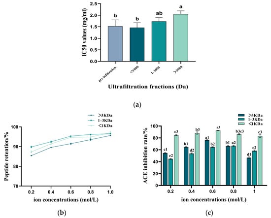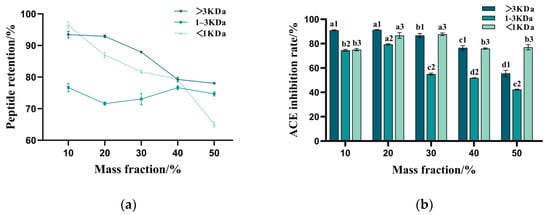 The concentration of NaCl significantly influenced the various components of TPPs (Figure 5b,c). As NaCl concentration increased, the retention of peptides of different molecular weights remained above 80%, suggesting that Na⁺ concentration had a minimal effect on the retention of TPPs. However, the ACE inhibitory activities of the peptides with three different molecular weights exhibited an initial increase followed by a decline, indicating a negative correlation between NaCl concentration and ACE inhibition rate, which aligns with the findings of Wang et al. [49] This phenomenon may be attributed to the high concentrations of NaCl reducing the solubility of proteins or peptides, resulting in flocculation or aggregation and consequently diminishing their activities [50].