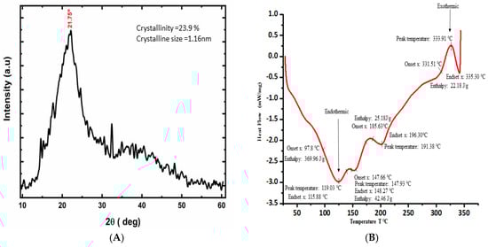 (A) X−ray diffraction pattern of papaya leaf powder. (B) DSC profile of papaya leaf powder in the temperature range of 25−300 °C, with a heating rate of 10 °C/min.