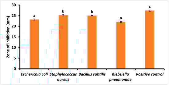 Antibacterial activity of papaya leaf extract against Gram-positive and Gram-negative bacterial species. The letter (a, b, c) above the bars indicate statistically significant differences among the groups (p < 0.05).