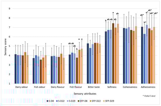 Sensory attributes evaluated by Quantitative Descriptive Analysis (QDA®) of texture-modified enriched salmon products, S (enriched with dairy proteins) and SFP (enriched with dairy proteins and fish protein hydrolysate) after storage for 8, 22, and 29 days at 4 °C. Sensory scores are presented as mean ± S.D. (n = 18). Means with different lowercase superscripts in the bar indicate significant differences calculated separately for each attribute. Attributes with no lowercase letters have non-significant differences.