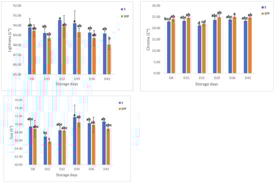 Changes in colour coordinates lightness L*, chroma C*, and hue angle h* of salmon sample S (with dairy proteins) and SFP (with dairy proteins and fish protein hydrolysate) for the 43-day storage period at 4 °C. The values are presented as a mean ± S.D. (n = 3). Means with different lowercase superscripts in the bar indicate significant differences.