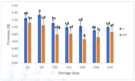 Firmness (N) of texture modified salmon products, sample S (with dairy proteins) and SFP (with dairy proteins and fish protein hydrolysate), for the 43-day storage period at 4 °C. The values are presented as a mean ± S.D. (n = 3 × 4). Means with different lowercase superscripts in the bar indicate significant differences.
