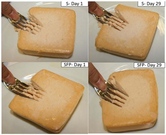 The observation showed that a higher pressure was needed to blanch the thumb nail white in S samples than the SFP samples. The blanching of thumbnail was more visible in both samples S and SFP on day 1 compared to day 29 (Figure 4). The observations from the fork test comply with results from instrumental measurement of texture, where S and SFP were significantly (p < 0.001) firmer on day 1 than after day 22, and throughout the storage period of 43 days. Several researchers have used the fork pressure test to validate samples of newly developed products for dysphagia patients [47,48,49]. However, the fork test is a subjective method, and different individuals can influence results, the applied pressure, and holding time.