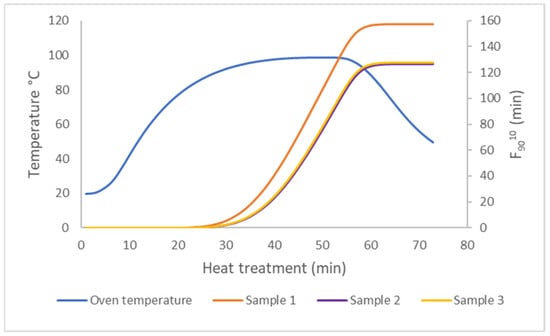 Elderly people are more susceptible to food-borne illnesses due to their compromised immune systems and the gradual loss of physical barriers. They have higher incidences of infection from foodborne pathogens such as Listeria, Salmonella and Staphylococcus [51]. The packages of salmon samples were therefore heated in a convection oven to a core temperature of 95 °C for 15 min per sample, inactivating non-spore-forming microorganisms. People with dysphagia are susceptible to foodborne disease [52], and safe pasteurization, packaging and storage is therefore crucial. Figure 5 shows accumulated F9010 values for three temperature probes, giving a variance in the core pasteurization values of the packages due to position in the oven and temperature fluctuations. The measured F9010 values were calculated based on D and z values from psychotropic non-proteolytic Clostridium botulinum type E (D90 = 1.66, z = 10) [53]. The pasteurization values ranged from 126 to 157, which were much higher than the heat load (D90 = 10) normally used for safety for a 6-log reduction in non-proteolytic Clostridium botulinum type E, indicating no survival of non-proteolytic Clostridium [53].