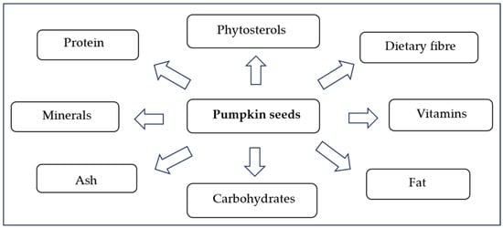 The pumpkin is a seasonal plant that belongs to the Cucurbitaceae family. There are three main pumpkin species used worldwide: Cucurbita pepo (common pumpkin), Cucurbita moschata (musk pumpkin), and Cucurbita maxima (giant pumpkin). The pumpkin’s edible parts are the fruit, seeds, leaves, and flowers. Pumpkin seeds contain many nutrients including lipids, proteins, carbohydrates, and vitamins (Figure 1) [,]. They also provide lecithin and bioactive molecules including tocopherols, β-carotene, lutein, phytosterols, and minerals [,]. They exhibit medicinal properties and have long been used in folk medicine for deworming children and adults, for liver and prostate diseases, and for their diuretic effect [,]. Pumpkin seeds also have antioxidant, anticancer, and anti-inflammatory effects [,]. These seeds may be eaten right after being hollowed out of the pumpkin or after they have been dried. They are perfect as an addition to salad dressings, casseroles, baked goods, and cereal mixes. They can also be ground and added to bread dough to improve its texture or used as an ingredient in various cakes instead of or in combination with nuts. Moreover, pumpkin seeds are consumers’ favorite snacks in many countries, especially when they are pre-roasted [].