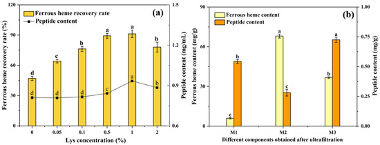 (a) Effects of Lys concentration on ferrous heme recovery rate and peptide content of the supernatant after enzymatic hydrolysis. (b) The ferrous heme content and peptide content of three components (M1 < 3 kDa, 3 kDa < M2 < 10 kDa, and M3 > 10 kDa) obtained by ultrafiltration. The results are presented as means ± SD (n = 3). Lowercase letters mean significant differences among different samples, with p < 0.05.