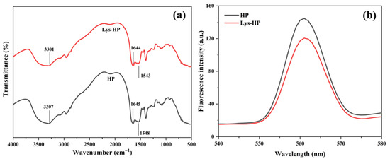 (a) FTIR spectra and (b) intrinsic fluorescence spectrometry of HP and Lys-HP.