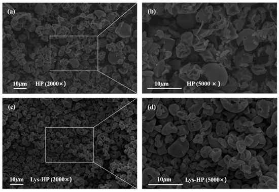 The micromorphology of HP and Lys-HP observed with scanning electron microscopy is shown in Figure 3. The spray-dried samples exhibited spherical shapes and a range of sizes, which are typical characteristics of particles produced through the spray-drying process. As can be noticed (Figure 3a,b), the particles of HP were semi-spherical and wrinkled, with noticeable dents on the surface. The wrinkles were caused by the spray-drying process, which generated steam pressure on the internal structure. This pressure led to rapid shrinkage as a result of moisture loss [41]. In contrast, compared to HP, the particles of Lys-HP exhibited a smooth surface and a spherical shape, with no wrinkles (Figure 3c,d).