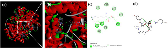 Binding interactions of Lys with Hb. Optimum docking conformations and interaction modes of (a–d) Lys with Hb, with (b) being a magnification of (a).