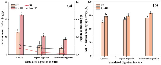 The effects of simulated pepsin–pancreatin digestion in vitro on (a) the ferrous heme content, the peptide content, and (b) the ABTS·+ radical scavenging activity of heme-peptides. Lower case letters indicate significant differences in content and activity of the same sample during simulated gastrointestinal digestion. (p < 0.05).